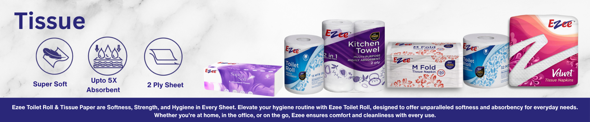 EZEE TOILET ROLL 13 MTR EZEE TOILET ROLL 25 MTR EZEE TOILET ROLL 32 MTR EZEE TOILET ROLL 42 MTR EZEE TOILET ROLL 4 X 1 EZEE TOILET ROLL 10X1 EZEE VELWET NAPKINS 50PCS EZEE VELWET NAPKINS 100 PCS EZEE CARBOX 100 PULLS/BOX EZEE KITCHEN MATE KITCHEN TOWEL EZEE KITCHEN MATE KITCHEN TOWEL 2X1 EZEE KITCHEN MATE KITCHEN TOWEL 4 X 1 EZEE KITCHEN MATE KITCHEN TOWEL 6 X 1 EZEE NONWOVEN KITCHEN TOWEL EZEE CARBOX 100 PULLS/BOX 4 X 1 EZEE M FOLD 130 PCS EZEE M FOLD 100 PCS EZEE SUPER SOFT FACE TISSUE 6X1 EZEE SUPER SOFT FACIAL TISSUE WE PROVIDE PLAIN AND EMBOSSED TOILET ROLLS WITH PREMIUM PACKAGING.